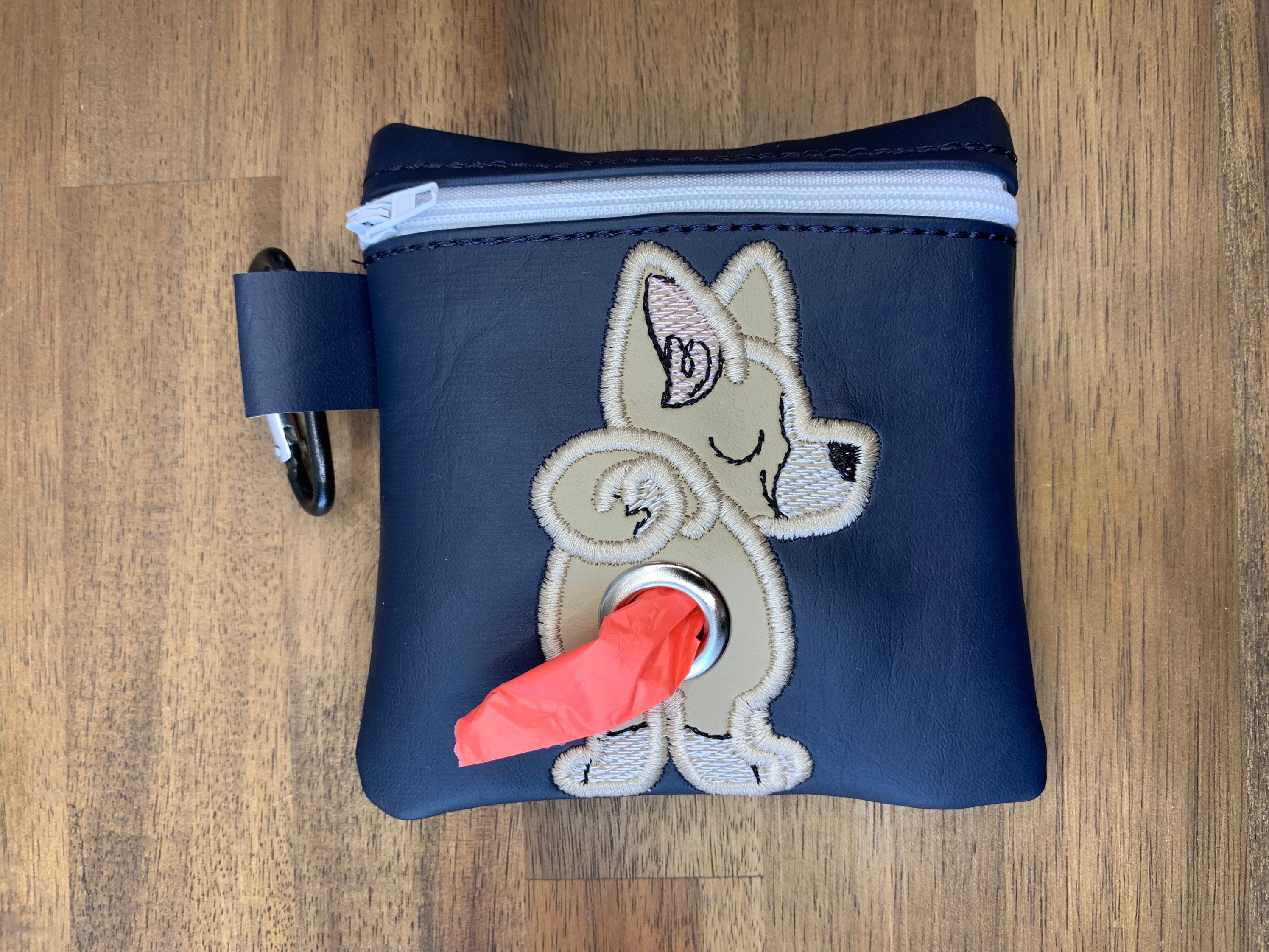 Each pouch measures 4.5 inches x 4.5 inches and they fit 2 rolls of poop bags. Each bag comes with a carabiner clip so that you can attach it to your belt or your leash.